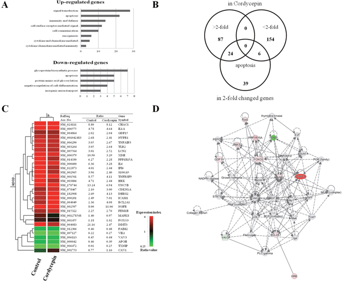 Figure 2: Gene expression analysis and signal network of apoptotic genes. A. Results of microarray analysis of gene expression in response to 60 μg/mL of cordycepin for 48 h. Genes showing twofold upregulation or downregulation identified for Gene Ontology analysis B. Venn diagram of gene expression in response to cordycepin genes that were altered more than twofold and apoptosis-related genes. C. Apoptosis-related genes lists that were altered more than twofold in response to cordycepin. D. Signal network of the apoptotic genes generated by using a Qiagen IPA.