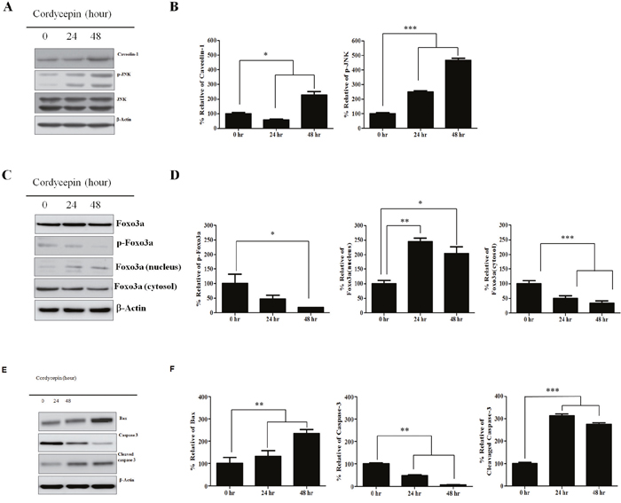 Figure 3: Expression of CAV1, p-JNK, JNK, Foxo3a, nuclear Foxo3a proteins in response to cordycepin. A. Western blots showing expression of caveolin-1, p-JNK, JNK, and B. relative band intensities of CAV1, p-JNK, JNK C. Total Foxo3a, p-Foxo3a, nuclear and cytosolic Foxo3a, and D. relative band intensities of p-Foxo3a, nuclear, and cytosolic Foxo3a E. Bax, caspase-3, and cleaved caspase-3 at 0, 24, and 48 h of cordycepin treatment of A549 cells, and F. relative band intensities of Bax, caspase-3, and cleaved caspase-3. Results are shown as mean ± S.E.M. Data were analyzed using Student's t-test. *p <0.05, **p < 0.01 and ***p < 0.001 vs. control.