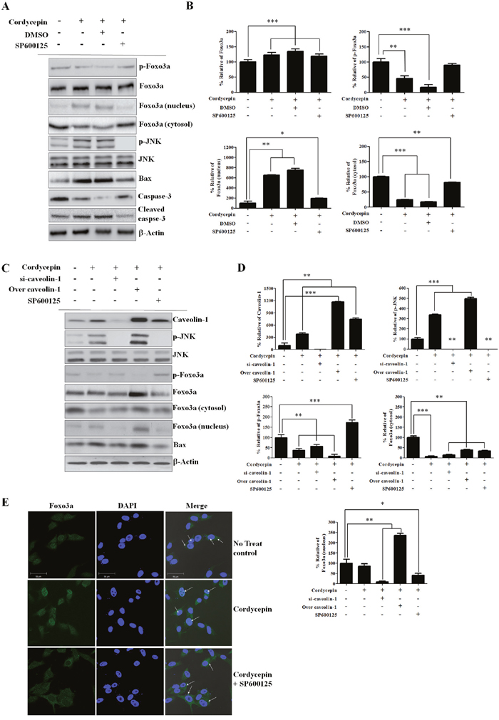 Figure 4: CAV1 phosphorylates JNK and regulates nuclear Fox3a translocation. A. Representative western blots of A549 cells No treated control and 60 μg/mL of cordycepin alone or in combination with DMSO or the JNK inhibitor 10 mM of SP600125 B. Relative band intensities of Foxo3a, p-Foxo3a, cytosolic Foxo3a, and nuclear Foxo3a. C. Western blots of CAV1, p-JNK, JNK, Foxo3a, p-Foxo3a, cytosolic Foxo3a, nuclear Foxo3a. A549 cells were incubated with si-CAV1 or negative control siRNA for 48 h, transfected with a CAV1-overexpression construct for 48 h, or treated with SP600125 for 48 h. D. Relative band intensities of p-JNK, p-Foxo3a, cytosolic Foxo3a, nuclear Foxo3a, CAV1, Bax. E. A549 cells were grown on glass coverslips and treated with cordycepin or cordycepin with 10 mM of SP600125 for 48 h. Samples were analyzed by indirect immunofluorescence with confocal microscopy. Arrows indicate the nuclei. The bar indicates 50 μm.