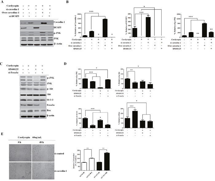 Figure 5: Knockdown of CAV1 leads to decreased p-JNK and Foxo3a is regulated by Akt and 14-3-3. A. Western blots of CAV1, DUSP5, p-JNK, and JNK. A549 cells were incubated with siRNA (si-CAV1) for 48 h, transfected with a CAV1-overexpression construct, or treated with siRNA against DUSP5 (si-DUSP5). CAV1-silenced A549 cells treated with cordycepin showed increased DUSP5 and decreased p-JNK, and siRNA inhibition of DUSP5 in these cells increased p-JNK as compared to control cells. B. Relative band intensities of CAV1, DUSP5, p-JNK/JNK ratio. C. Representative western blots of JNK, pAkt, Akt, 14-3-3, and Foxo3a in A549 cells treated with cordycepin, SP600125, or siRNA targeting Foxo3a (si-Foxo3a). D. Relative band intensities of p-JNK, p-Akt, 14-3-3, Bax. E. Migration ability of A549 cells as examined by wound-healing assay. Migrating cells were photographed under an inverted fluorescence microscope (magnifications: 100×). Quantification of the numbers of migrating are presented as the mean ± standard deviation of three independent experiments performed in triplicate. *p <0.05, **p < 0.01, ***p < 0.001 vs. negative control (0 μg/mL).