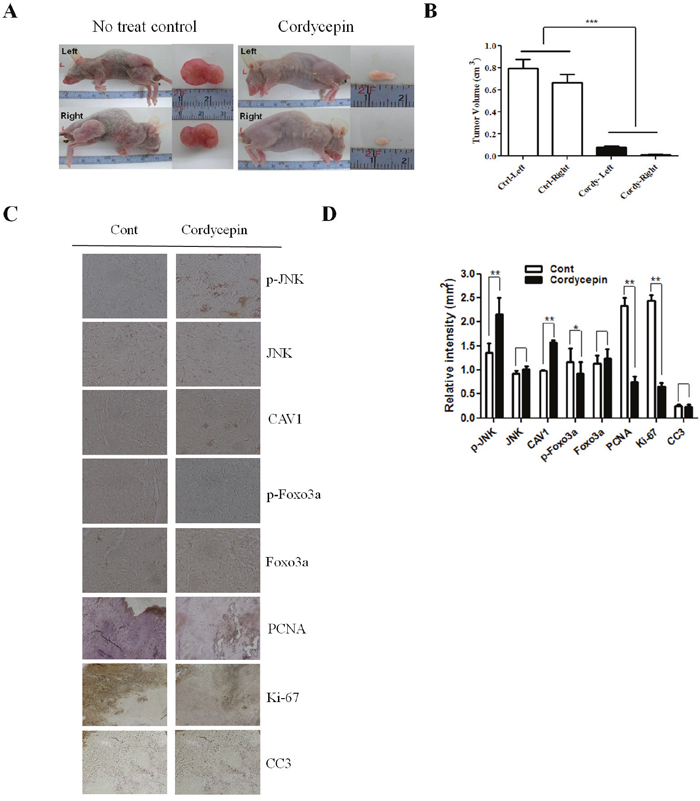 Figure 6: Effect of cordycepin on expression of CAV1, p-JNK, JNK, p-Foxo3a and Foxo3a in lung tumor tissue. A. Nude mice were injected with A549 cells and then treated with PBS (n = 6) or 20 mg/kg cordycepin (n = 6) once daily for 20 days. Dissected tumors are shown in the right panel. Tumor volumes of control and cordycepin-treated mice. B. Bar graph showing that the tumor volume in the cordycepin-treated group was lower than that in the non-treated control group. C. Tumor tissues were collected for immunohistochemistry of CAV1, p-JNK, JNK, p-Foxo3a, and Foxo3a as described in the Materials and Methods. Representative photomicrographs of five independent tumor samples are shown. D. Quantification of CAV1, p-JNK, JNK, p-Foxo3a, and Foxo3a. Data are presented as the mean ± standard deviation of three independent experiments performed in triplicate. *p < 0.05 and ** p < 0.01 vs. the control.