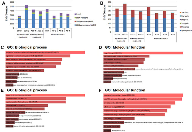 Figure 2: SNV (single-nucleotide variant) analysis. (A) Distribution of total SNVs for each sample in 1000 genome and dbSNP. 1000 genome and dbSNP: the number of SNVs that fall into both 1000 genome and dbSNP; 1000 genome specific: the number of SNVs that only fall into 1000 genome, not in dbSNP; dbSNP specific: the number of SNVs that only fall into dbSNP, not in 1000 genome; The SNVs that fall into neither 1000 genome nor dbSNP were considered as “novel”. (B) Distribution of total SNVs that fall into the different categories leading to different genetic characters. Startloss: a nonsynonymous SNV that leads to the immediate elimination of start codon at the variant site; Startgain: a nonsynonymous SNV that leads to the immediate creation of start codon at the variant site; Stoploss: a nonsynonymous SNV that leads to the immediate elimination of stop codon at the variant site; Stopgain: Stoploss: a nonsynonymous SNV that leads to the immediate creation of stop codon at the variant site; Missense: a single nucleotide change that cause an amino acide change; Synonymous: a single nucleotide change that does not cause an amino acid change. (C) and (D) Gene Ontology (GO) analysis of SNVs specific in adenocarcinoma of pancreatic tissues. (C) Gene Ontology (GO): Biological process analysis; (D) Gene Ontology (GO): Molecular function analysis. (E) and (F) Gene Ontology (GO) analysis of SNVs specific in squamous cell carcinoma of pancreatic tissues. (E) Gene Ontology (GO): Biological process analysis; (F) Gene Ontology (GO): Molecular function analysis.