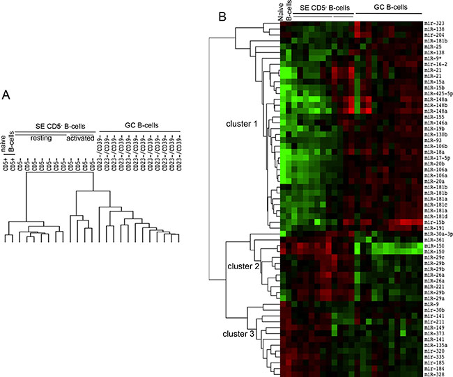 Figure 1: Expression profile of miRNAs in cell subsets representing different stages of B cell maturation. CD5+: naïve B cells from tonsils; CD23−CD39−: germinal centre (GC) B cells from tonsils; CD5−: subepithelial (SE) mature B cells from tonsils, subdivided in CD5− resting and CD5− activated B cells. (A) Array tree of 25 samples representing different stages of maturation of the B cells based on the expression levels of miRNAs. (B) The heat map describes the expression levels of 48 differentially expressed miRNAs in 25 samples owning to four B cell subsets isolated from tonsils (FDR 1%). Clusters 1, 2 and 3 are three miRNAs groups isolated by clustering procedures. Red, higher expression (log2, +4); green, lower expression (log2, −4).