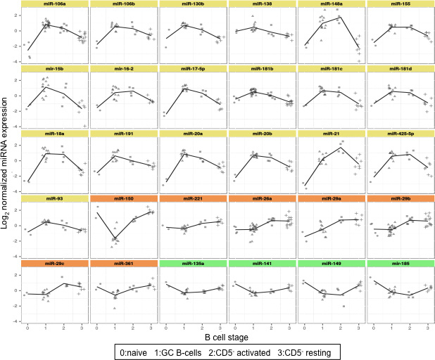 The average expression levels of the top 20 significantly differentially expressed miRNAs (Figure 2) demonstrated that they were mostly upregulated in mature B cells. In contrast, miR-150, miR-361, miR-221, miR-135a, miR-141, miR-185 and miR-149 decreased in GC B cells compared to naïve B cells.