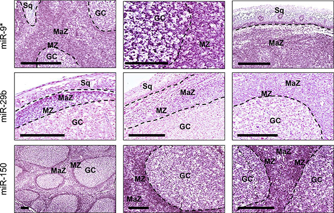 Figure 4: MiR-9*, miR-29b and miR-150 distribution in normal tonsillar tissue. The expression of the three miRNAs was detectable in pharyngeal tonsils as a grainy blue cytoplasmic staining. MiR-9* was significantly overexpressed in germinal centers (GC), mantle zone (MZ), and subepithelial marginal zone (MaZ) in comparison to squamous epithelium (Sq). At higher magnification, it is evident a stronger expression in GC cells in comparison to MZ. MiR-29b was significantly overexpressed in both MZ and MaZ in comparison to GC, whereas miR-150 was significantly downregulated in GC in comparison to MZ and MaZ. Bar scale = 200 μm.