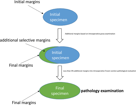 Additional margins were also obtained for pathological evaluation due to intraoperative gross examination by the surgeon or by a stand-by pathologist. Intraoperative frozen section evaluation for selective PM margins was not routinely applied in our centre except in a very small number of cases (less than 3%) when required by the surgeon (Figure 1).