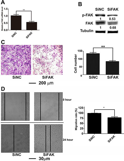 Figure 1: Down-regulation of FAK suppressed the migration of B16F10 cells. (A) The mRNA level of FAK in SiNC and SiFAK cells. (B) The expression of FAK and p-FAKY397 in SiNC and SiFAK cells. Normalized densitometry results are also presented. (C) Migration of SiNC and SiFAK cells analyzed by transwell assay. (D) Migration of SiNC and SiFAK cells analyzed by wound healing assay.