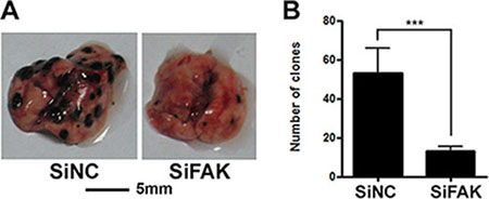 Figure 2: FAK promoted tumor metastasis. (A) The tumor nodules formed on the mouse lungs that 17 days after mice were injected intravenously with SiNC and SiFAK cells. (B) Quantitative analysis of tumor nodules. The result was expressed as the mean ± SD.