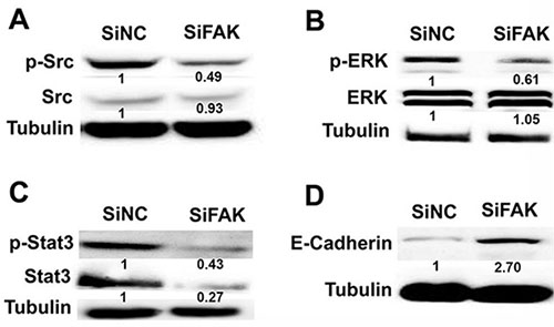 Figure 3: The effects of FAK on Src, p-SrcY416, ERK1/2, p-ERK1/2, Stat3, p-Stat3Y705 and E-Cadherin expression. (A) The expression of Src and p-SrcY416, (B) ERK1/2 and p-ERK1/2, (C) Stat3 and p-Stat3Y705 and (D) E-cadherin expression in SiNC and SiFAK cells were examined by western blotting. Normalized densitometry results are also presented.