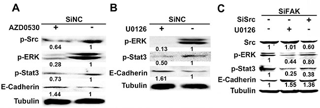 Figure 4: p-SrcY416/p-ERK1/2/p-Stat3Y705 signaling pathway was involved in FAK mediated E-cadherin expression. (A) The expression of p-SrcY416, p-ERK1/2, p-Stat3Y705 and E-cadherin in SiNC cells incubated with or without Src inhibitor AZD0530 (5 μM) for 24 hours. (B) The expression of p-ERK1/2, p-Stat3Y705 and E-Cadherin in SiNC cells incubated with or without ERK1/2 inhibitor U0126 (10 μM) for 24 hours. (C) The expression of Src, p-ERK1/2, p-Stat3Y705 and E-cadherin in SiFAK cells incubated with U0126 (10 μM) or transfected with SiSrc. Normalized densitometry results are also presented.