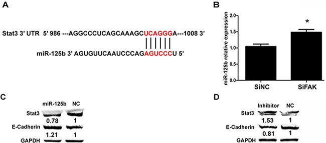 Figure 5: miR-125b promoted E-cadherin expression. (A) The duplex between miR-125b and mouse stat3 3′ UTR predicted by mirbase (http://www.mirbase.org). (B) The expressions of miR-125b in SiNC and SiFAK cells were examined by QRT-PCR. The results were expressed as the mean ± SD. (C) The expressions of Stat3 and E-cadherin in SiFAK cells transfected with miR-125b mimic and NC. (D) The expressions of Stat3 and E-cadherin in SiFAK cells transfected with miR-125b inhibitor and NC. Normalized densitometry results are also presented.