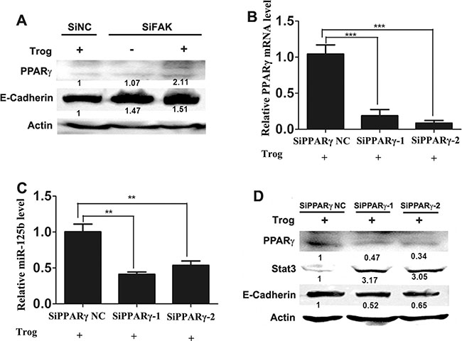 Figure 6: PPARγ promoted miR-125b expression. (A) The expression of PPARγ and E-cadherin in SiNC and SiFAK cells that incubated with Trog (20 μM). (B) The expression of PPARγ mRNA in SiFAK cells that transfected with PPARγ interference RNA SiPPARγ-1, SiPPARγ-2 and treated with Trog (20 μM). (C) QRT-PCR examined the expression of miR-125b in SiFAK cells after transfected with PPARγ interference RNA SiPPARγ-1, SiPPARγ-2 and incubated with Trog (20 μM). (D) The expression of PPARγ, Stat3 and E-cadherin in SiFAK cells after transfected with PPARγ interference RNA SiPPARγ-1, SiPPARγ-2 and incubated with Trog (20 μM). Normalized densitometry results are also presented.