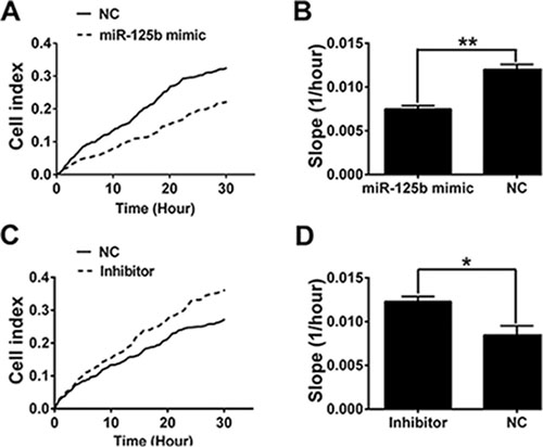 Figure 7: miR-125b inhibited B16F10 cell migration. (A, B) The migrations of B16F10 cells transfected with miR-125b mimic and negative control were analyzed by RTCA. ** indicates p < 0.01. (C, D) The migrations of B16F10 cells transfected with miR-125b inhibitor and negative control were analyzed by RTCA. * indicates p < 0.05.