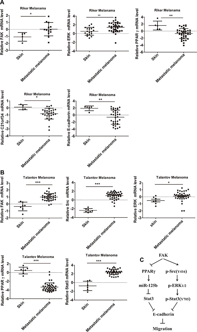 As indicated by data from Oncomine database, compared with normal controls, the expressions of FAK, Src, ERK1/2, Stat3 mRNA increased, while the expressions of PPARγ, C21orf34 and E-cadherin decreased in human melanoma cancer and breast cancer. In conclusion, our data indicated that FAK inhibited the expression of E-cadherin via p-SrcY416/p-ERK1/2/ p-Stat3Y705 and PPARγ/miR-125b/Stat3 signaling pathway in both melanoma cells and human tumors. Our study suggests that FAK may be a potential target for melanoma therapy.