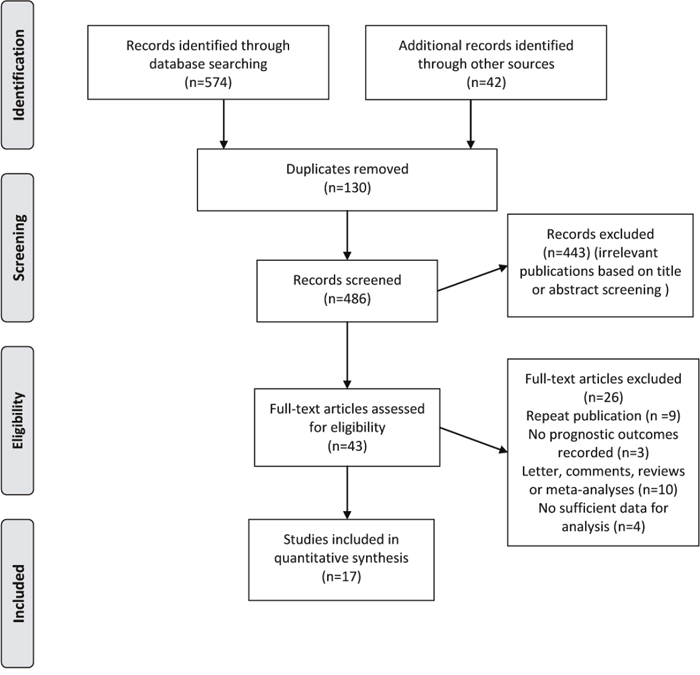 Literature search generated a total of 616 citations, of which 43 appeared relevant through title/abstract selection and were retrieved for further full text evaluation (Figure 1). Finally, 17 studies met all eligibility criteria and were included in the meta-analysis [11-17, 19, 22-30] (Figure 1 and Supplementary Table 1).