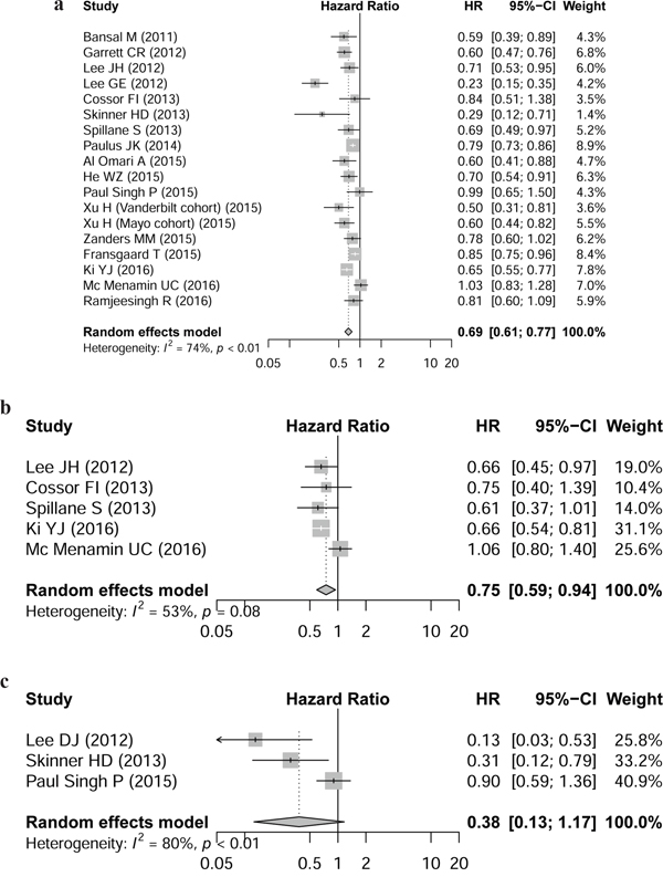 Figure 2: Hazard ratio for association between metformin intake and a. overall survival, b. cancer-specific survival, c. disease-free survival. Forest plots of 17 cohorts. Weights are from random effects analysis.