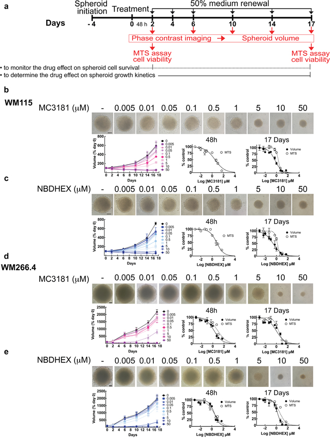 Figure 1: MC3181 and NBDHEX concentration-dependent inhibition of tumor spheroid growth. a. Schematic illustration of tumor spheroid growth kinetics and compound treatment procedures. Spheroids were treated with drug or drug vehicle 4 days after cell plating (day 0); 50% medium replenishment was performed on days 2, 4, 6, 10 and 14. b-c. WM115 and d-e. WM266.4 spheroids treated with graded concentrations of MC3181 (b and d) or NBDHEX (c and e). Control spheroids were treated with vehicle. Spheroid growth kinetics (left) was evaluated by phase contrast imaging at day 2, 6, 10, 14 and 17, whereas the concentration-response curves relative to the MTS assays and spheroid volume analysis were obtained after 48 hours (center) and 17 days (right) of drug treatment. Phase contrast images (10X magnification, 3X digital magnification) correspond to 17 days treated spheroids. Scale bar: 100 μm. Values are means ± SD (n = 12).