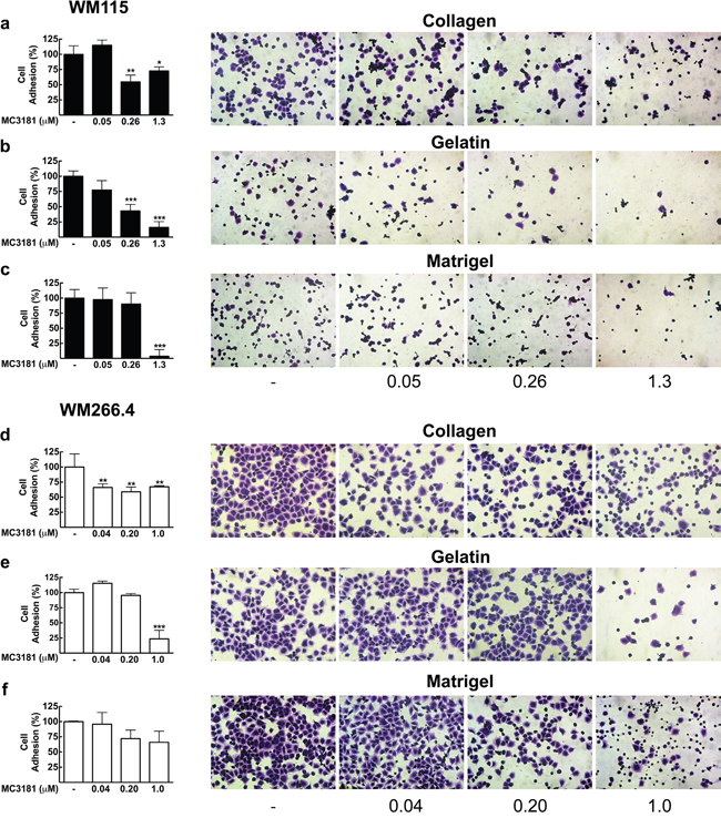 Figure 2: Effect of MC3181 on the adhesion of human melanoma cells to different ECM components. WM115 cells and WM266.4 cells (3x105/ml) were applied to individual coated wells with 200 μl of a, d. collagen (7.5 μg/ml), b, e. gelatin (0.1%) or c, f. Matrigel (0.2 mg/ml), in the absence and in the presence of increasing MC3181 concentrations, and incubated for 30 minutes at 37°C in 5% CO2. Cells were then fixed and colored with crystal violet. Images (20X magnification, 3X digital magnification) were obtained by phase contrast microscopy. The absorbance values of wells were measured at 580 nm after dissolving crystal violet with 100% methanol. The results were expressed as the mean percentage of cell adhesion ± SD versus control, repeated in triplicate; *P < 0.05, **P < 0.005 and *** P < 0.0005 vs control.