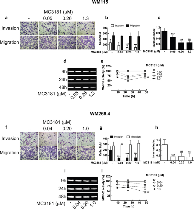 Figure 3: MC3181 blocks WM115 and WM266.4 melanoma cells invasion and inhibits MMP2 activity. Cell lines were assayed for in vitro invasion and migration using Boyden chamber without coating (migration) or coated with 5 μg of Matrigel. After 48 hours of treatment with graded MC3181 concentrations, migrated and invaded cells per field were stained with crystal violet and counted. Representative phase contrast images (10X magnification, 3X digital magnification) of a. WM115 and f. WM266.4 are shown.Migrated/Invaded b. WM115 and g. WM266.4 cells. The invasion index of c. WM115 and h. WM266.4 cells was calculated as the invasion percentage of treated cells divided by the invasion percentage of non-treated cells (see equations 2 and 3 in “Materials and Methods” section). Intracellular MMP-2 activity was measured by gelatin zymography assay on d. WM115 and i. WM266.4 cells treated with graded MC3181 concentrations for up to 48 hours. ImageJ quantification of 3 independent experiments of gelatin zymography performed on e. WM115 and l. WM266.4 cells. The control has been settled as the 100%, and results were expressed as the mean percentage of MMP-2 activity ± SD vs control. **P < 0.005 and ***P < 0.0005 vs control.