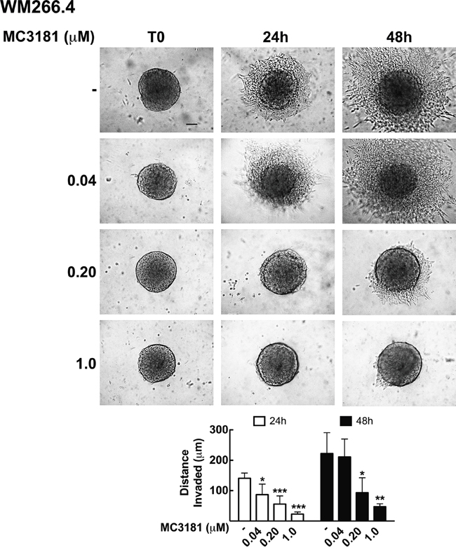 Figure 6: MC3181 inhibits WM266.4 spheroids invasion into type I collagen. 3D melanoma spheroids were embedded in a collagen matrix and treated with 0.04, 0.20 and 1.0 μM MC3181. The distance invaded by WM266.4 cells was monitored by phase contrast imaging (10X magnification, 3X digital magnification), over a 48 hours incubation period. Scale bar: 100 μm. The graph shows the mean distance invaded by spheroids ± SD; sample number: n = 10 for every condition; *P < 0.05, **P < 0.005 and ***P < 0.0005 vs the respective time-matched control.