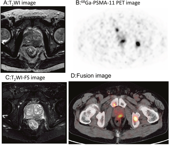 Recent advances in magnetic resonance imaging (MRI) of the prostate gland have improved our ability to detect and stage prostate adenocarcinoma, and multiparametric MRI further facilitated clinical risk assessment and predicting outcomes in prostate cancer [9]. Moreover, MRI/TRUS biopsy is now recommended by the American Urological Association for patients undergoing repeated prostate biopsies [10]. However, MRI may miss up to 20% of clinically significant cancers; it has low sensitivity for the detection of lymphadenopathy, and specificity is also limited [11–14]. Prostate adenocarcinoma in the peripheral zone shows low signal intensity that is easily distinguished from the normal high-signal peripheral zone, but the low signal intensity is nonspecific and may also be seen in benign conditions, such as prostatitis and post-radiation fibrosis.
