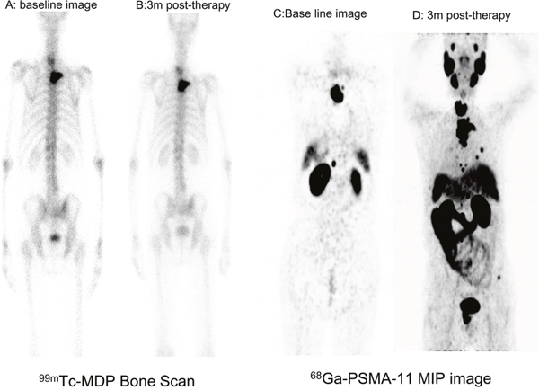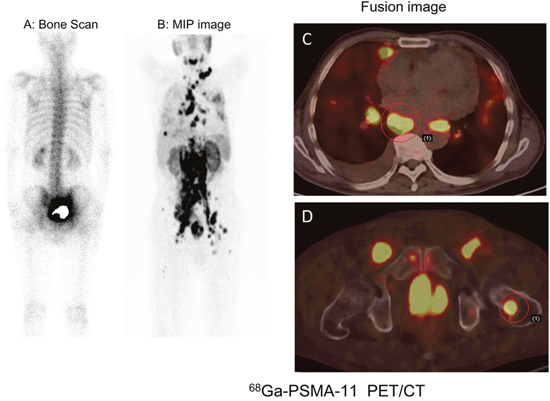 Figure 7: Serial 68Ga-PSMA-11 images in a case with progressive mCRPC. A, B. Bone scan showing no changes in a patient with mCRPC after ADT therapy. C, D. 68Ga-PSMA-11 PET/CT revealed multiple metastases and progression compared to a baseline image.