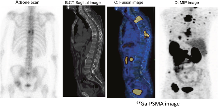Figure 2: 68Ga-PSMA-11 PET/CT versus bone scan for the evaluation of multiple metastases in a 73-year-old patient with right leg edema. Besides the primary prostatic lesion, multiple PSMA-avid lesions in lymph node and bone metastases were detected on 68Ga-PSMA-11 images. A. Bone scan. B, C, D. 68Ga-PSMA-11 images: B, MIP image; C, thoracic fusion image; D, Pelvic fusion image.
