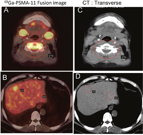 Figure 4: Early detection of PCa metastasis on 68Ga-PSMA-11 PET/CT images. Two years after androgen-deprivation therapy, a patient with mCRPC showed elevated PSA (5.2 ng/ml) and moderate uptake in the fifth cervical vertebra on a bone scan. PSMA avid lesions were at C5 and in the liver. A, B. 68Ga-PSMA-11 PET/CT fusion image. C, D. CT image.
