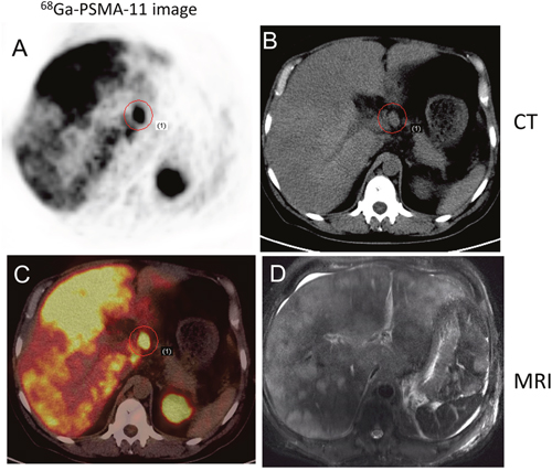 Figure 5: 68Ga-PSMA-11 PET/CT versus T2WI MRI in a 52-year-old patient with progressive disease. PCa was confirmed by lymph node aspiration; the serum PSA level was >10,000 ng/ml at the time of imaging. 68Ga-PSMA-11 PET/CT detected multiple lymph node and liver metastases. A. Transverse image. B. CT. C. Multiple sites of focal uptake in the liver. D. MRI.