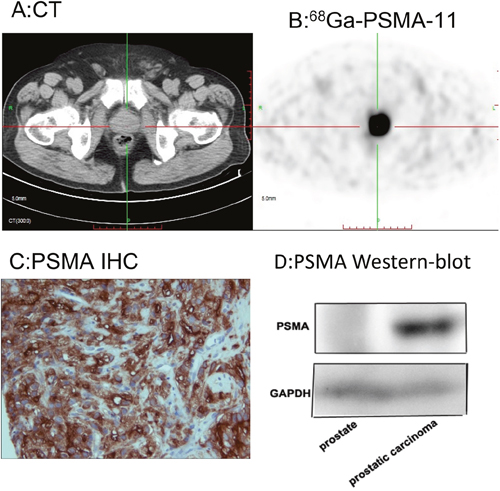 Figure 6: 68Ga-PSMA-11 PET/CT enables quantitation of PSMA expression in the primary lesion, which was consistent with histopathological analysis. 68Ga-PSMA-11 PET/CT showed high focal uptake in the primary prostatic lesion. A. CT image. B. Fusion image. C. PSMA immunostaining. D. Western blot.