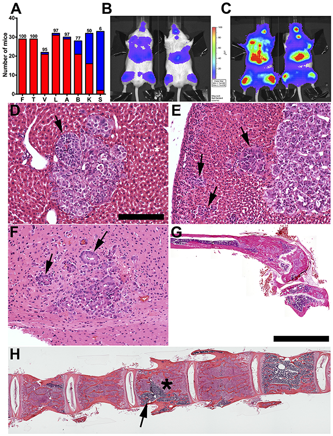 Figure 1: Incidence, kinetics, and histopathology of skeletal and solid organ metastases in NOD/SCID/IL2Rγ (NSG) immunodeficient mice. A. Experimental metastases incidence percentage (above each column red is number of mice with detectable tumors, blue is mice with undetectable metastases) following left ventricular injection of 5X105 IGR-CaP1 cells (n=29-32 mice). B. BLI signals were detectable in bone and visceral sites 2 weeks post intracardiac injection increasing in intensity at 4 weeks (vertical scale bar (photons/sec/cm2/steradian) is the same for B and C). D. Liver and E. adrenal metastasis (black arrows) with “pseudo-glandular” morphology (see also Supplementary Figure 1). F. Brain metastasis with well differentiated tumor cells arranged in a rosette-like morphology surrounding microvessels consistent perivascular pseudo rosettes (black arrows). G. Femoral metastases with extensive intramedullary new bone formation. H. Lumbar vertebral column metastases with variable tumor (asterisk) versus normal marrow (arrow) replacement. Compared to femur, G, there is less extensive new bone formation. Bars: D-F: 200 μm; G, H: composite images of multiple 4X fields, 4 mm.