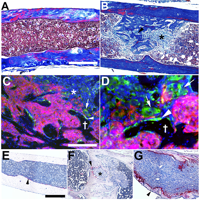 Figure 2: IGR-CaP1 cells create osteoblastic metastases at multiple skeletal sites. A. Trichrome stain of tibial shaft in a nontumor bearing mouse. B. Trichrome stain of IGR-CaP1 metastases in tibia shaft revealing extensive intracavitary osteogenesis (asterisk and black arrowhead tumor cells, completely surrounded by new bone formation). C. Osteocalcin (osteoblast marker) immunofluorescence (Green) reveals osteoblast activation in juxtaposed to metastatic IGR-CaP1:CBRLUC-mCherry (Red) cells (arrowhead). There is also evidence for “osteomimicry” with osteocalcin expression evident in mCherry negative metastatic IGR-CaP1 cells (asterisk, and arrow) Latin cross: bone trabecula. D. Higher magnification view of C, to highlight osteoblast-tumor cell juxtaposition (arrowhead) and osteocalcin expression in mCherry negative and positive (arrows) IGR-CaP1 cells. E. TRAP stain (Red-Pink, Blue, hematoxylin nuclear counterstain) (osteoclast activity) of normal bone (arrowhead). F. Low level osteoclast activity (arrowhead) in an osteoblastic IGR-CaP1 metastasis (asterisk). G. Intense osteoclast activity in a renal cancer (786-O cells) osteolytic skeletal metastasis with microbreaks in the bone cortex (arrowhead). Blue C, D: DAPI. Bars: A, B: 400 μm; C, D: 200 μm, E-G: 100 μm.