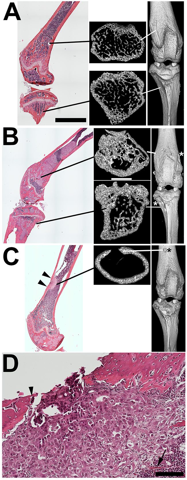Figure 3: MicroCT reveals both bone remodeling consistent with metastatic tumor-mediated new bone formation and focal osteolysis. A. Femur and proximal tibia from a non-tumor bearing NSG mouse with transaxial and 3D images. Note the fine trabecular structure of both metaphyseal regions. B. H and E staining reveals extensive tumor replacement of the femoral and tibial metaphysial regions in an IGR-CaP1 injected mouse. MicroCT reveals increased intramedullary bone volume in both regions. 3D rendering of these bones reveals cortical defects in both distal femur and proximal tibia (asterisk). C. Histological staining of another IGR-CaP1 injected mouse reveals a focal diaphysial cortical disruption with remodeling-mediated cortical thickening at each edge of the breach (arrowheads). Transaxial microCT of the same region showing the cortical disruption and thickening of one edge. 3D view also detected the cortical lesion (asterisk). D. Histology of the cortical disruption of C. Surprisingly, there is a paucity of osteoclasts (arrowhead) given the obvious osteolytic activity. An intramedullary artery is seen supplying the tumor (arrow). Bars: A-C (H+E sections): 4 mm. A-C (microCT): 1 mm; D: 100 um.