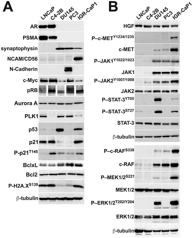 Figure 4: IGR-CaP1 cells express a subset of molecules coordinating the aggressive disease phenotype. A. Robust AR and PSMA expression in LNCaP and C4-2B cells, with lack of expression of these proteins in IGR-CaP1, PC3 and DU145 cells. In contrast, the AR(–) cell lines including IGR-CaP1, express synaptophysin. IGR-CaP1 also evidence the greatest level of NCAM expression, but N-Cadherin is undetectable. IGR-CaP1 cells do not differentially express c-Myc, Aurora A, and polo-like kinase-1 (PLK1), and retain retinoblastoma protein expression. P53 protein is markedly expressed in both IGR-CaP1 and DU145 cells, while p21 expression is differentially elevated in IGR-CaP1, LNCaP and C4-2B cells. Phospho-p21 is easily detectable in all cell lines save for trace detectability in LNCaP cells. BclxL is differentially elevated in the AR(–) compared to the AR(+) cell lines, while Bcl2 is equivalently expression by all of the cell lines. Phospho-histone 2A (p-H2A.XS139) is differentially elevated in IGR-CaP1 and the AR(+) cell lines. B. HGF is equivalently expressed in all cell lines, but high-level phospho-c-METY1234/1235 and c-MET are markedly elevated in IGR-CaP1 compared to all other cell lines. AR(–) cells differentially express the downstream c-MET signaling components, phospho-JAK1 and JAK2 and phospho-STAT3Y705/S327 compared to AR(–) cells. Phospho-c-RAF (Ras interaction site), MEK, and ERK1/2 are expressed at the greatest levels in IGR-CaP1 cells compared to all other cell lines.