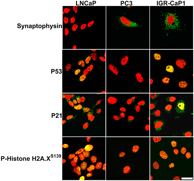 Figure 5: Intracellular localization of proteins detected by single slice, mid-nuclear plane, confocal microscopy of cultured IGR-CaP1 cells. Synaptophysin protein is detected in vesicles throughout the cytoplasm in IGR-CaP1 and PC3 cells, but is not evident in LNCaP counterparts. p53 protein is nuclear localized and heterogeneously expressed IGR-CaP1 and LNCaP cells but absent in p53 counterparts. High level p21 expression is evident in IGR-CaP1 cells but is nuclear excluded in most cells. In contrast p21 is predominantly nuclear localized in LNCaP counterparts. Both IGR-CaP1 and LNCaP cells express high level, nuclear foci localized H2A.XS139. Green: each target protein, Red: TOPRO3. Bar: 20 μm.