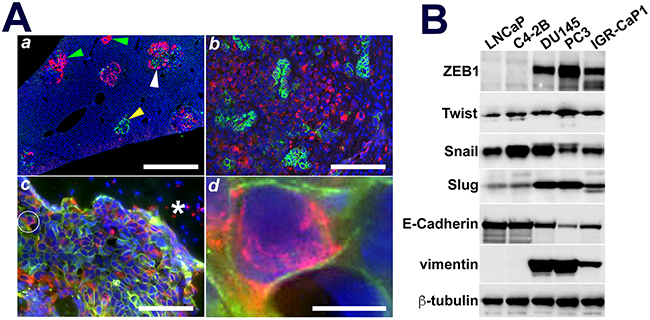 Figure 6: IGR-CaP1 metastatic subpopulations express organ dependent mixtures of epithelial or mesenchymal cell clusters or EMT in-transit cells. A. Liver, brain, and adrenal metastases, Aa, Ab, Distinct clusters of E-cadherin (yellow arrowhead) or vimentin (green arrowheads) positive cells either as solo tumors or adjacent to sheets of vimentin expressing cells in liver and brain metastatic tumors. Ac. Bone metastases contain an admixed population of E-cadherin and vimentin positive cells, most of which are EMT transition cells (white circle). Ad. EMT transition cell cropped and enlarged from Ac wherein the plasma membrane localized E-Cadherin and cytoplasm-localized vimentin is evident. B. AR(–) cells evidence differentially elevated EMT transcriptional regulators, ZEB1 and Slug, with essentially equivalent Twist across all cell lines. Vimentin was solely detectable in AR(–) cells, while E-cadherin was downregulated but still detectable in AR(–) compared to robust expression in AR(+) cells. IGR-CaP1 cells expressed near equivalent E-cadherin and vimentin proteins, while PC3 and DU145 cells massively overexpressed vimentin compared to E-cadherin; consistent with the EMT transition phenotype of IGR-CaP1 cells. Green: E-Cadherin; Red: vimentin; Blue: DAPI. Ac: Asterisk is bone trabecula. Bars: Aa: 1 mm, Ab: 200 μm, Ac: 100 μm; Ad: 5 μm.