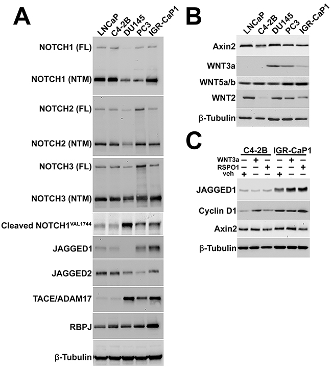 Figure 7: NOTCH and WNT pathway activation in IGR-CaP1 cells. A. IGR-CaP1 cells express NOTCH receptors 1-3. The IGR-CaP1, PC3, and DU145 cells express higher cleaved, activated NOTCH1 intracellular domain (NICD) protein than LNCaP and C4-2B cells. IGR-CaP1 cells express differentially elevated Jagged-1, and the NICD transcriptional effector, RBPJ expression compared with all other cell lines, whereas the TACE/ADAM17 protease is overexpressed in each AR(–) cell line. B. Detectable WNT 3a expression is restricted to the AR(–) cell lines, while the non-canonical ligand WNT5a/b is differentially elevated in IGR-CaP1 cells. C. WNT target gene response to recombinant human (rh) WNT3a or R-spondin1 (RSPO1) stimulation in IGR-CaP1, compared to C4-2B cells. Jagged1 expression is solely increased by both rhWNT3a and rhRSPO1 in IGR-CaP1 cells.