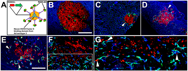 Figure 8: “Triple targeted” adenoviral vector containing three mutations designed to affect three aspects of adenoviral gene delivery in metastatic tumors. A. A cyclized RGD peptide was inserted into the HI loop of the fiber knob. Liver “detargeting” was achieved by swapping the wild type coagulation Factor X capsid hexon binding site for the equivalent, though nonbinding, serotype 3 hexon region (H5/H3). The ROBO4 enhancer/promoter (3 kb) produces endothelial cell (EC) specific expression with a bias for tumor compared to normal organs. B. Liver metastasis with minimal vector expression in surrounding liver parenchyma. C. Kidney metastasis. D. Adrenal metastasis. E. Brain metastasis. F. Tibial shaft metastasis. G. Cropped, enlarged image from E (white rectangle). Single and clusters of IGR-CaP1:H2B/RFP cells and juxtaposed to the EC abluminal surface of Ad.RGD.H5/3.ROBO4 expressing vessels, particularly in kidney, adrenal, brain, and bone metastases (white arrowheads) (organs and bones were harvested from mice 3-4 days post intravenous injection). Red: IGR-CaP1:H2B/RFP; Green: RGD.H5/3.ROBO4-EGFP; Blue: CD31/endomucin cocktail, blue background in liver are hepatocytes. Bars: B-D, F: 400 μm, E, G: 200 μm.