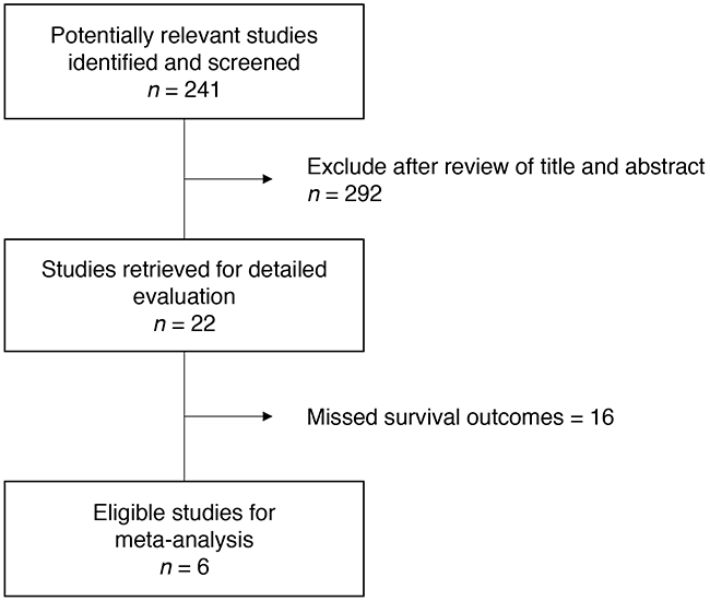 Figure 1 is the flowchart of studies assessed through the searching process. Based on our searching criteria, 22 studies were retrieved for detailed evaluation. Among them, 16 studies missed survival outcomes and were excluded from the study. Finally, the remaining 6 studies [14–19] fulfilled our inclusion criteria and were included in the meta-analysis. Three studies [14–16] with 244 patients were analyzed to investigate if VHL gene alteration acts as a predictive biomarker of VEGF-targeted therapy and the other 3 studies [17–19] with 419 patients were included in the survival analysis. All patients included in the six studies had clear cell RCC.