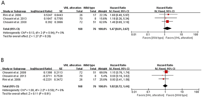 These studies investigated the clinical impact of VHL alteration on the efficacy of VEGF- targeted therapy in patients with metastatic RCC. When patients with VHL gene alterations compared with the wild-type patients, the pooled relative risk (RR) for overall response rate (ORR) was 1.47 [95% confidence interval (CI), 0.81-2.67], with no statistical significance (P = 0.20) (Figure 2A).