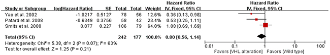 Table 2 shows 3 studies included in the prognostic marker analysis. We pooled the survival data from the studies to evaluate the association of VHL alteration and overall survival (OS) in patients with metastatic RCC. Two studies [17, 18] directly presented HR and 95% CI for OS. In the remaining one study [19], we calculated HR and 95% CI by analyzing Kaplan-Meier curve. As shown in Figure 3, there was no significant association between the VHL alteration and OS (HR = 0.80 [95% CI, 0.56-1.14], P = 0.21), with no heterogeneity between the studies.