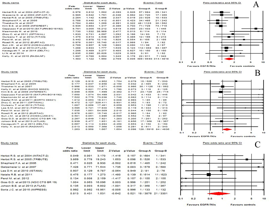 Figure 2: Risk of infections associated with EGFR-TKIs treatment compared with placebo treatment: A. all-grade infections, B. high-grade infections, C. fatal infections.