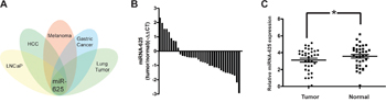 Figure 1: miR-625 is downregulated in malignant melanoma tissues. A. Overview of cluster analysis of deregulated microRNAs in several common tumors. miR-625 is an overlapping candidate. B. miR-625 was detected in melanoma tissues. The data are shown as -ΔΔCT values. C. Relative expression of miR-625 in malignant melanoma patients’ tumor tissues compared with normal tissues. Data are shown as mean ± SEM (*P < 0.05).