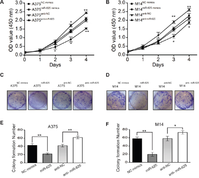 Figure 2: The effect of miR-625 on the proliferation of malignant melanoma cells. A. Cell proliferation was measured by the WST assay. A375 cells were transfected with miR-625 mimics, NC mimics, anti-625, or anti-NC at a final concentration of 100 nM, at 24 hours after transfection. The WST assay was performed every 24 hours for 4 days. Results are means of three independent experiments ± S.D. (*P < 0.05, **P < 0.01). B. M14 cells were transfected with miR-625 mimics, NC mimics, anti-625, or anti-NC at a final concentration of 100 nM, at 24 hours after transfection. The WST assay was performed every 24 hours for 4 days. Results are means of three independent experiments ± S.D. (*P < 0.05, **P < 0.01). C. The effect of miR-625 on cell proliferation was evaluated by the plate colony formation assay. A375 cells were transfected with miR-625 mimics, NC mimics, anti-625, or anti-NC, and then seeded onto 6-well plates. The number of colonies was counted on the 14th day after seeding. D. M14 cells were transfected with miR-625 mimics, NC mimics, anti-625, or anti-NC, and then seeded onto 6-well plates. The number of colonies was counted on the 14th day after seeding. E-F. Colonies containing 50 or more cells were counted. Results are means of three independent experiments ± S.D. (*P < 0.05, **P < 0.01).