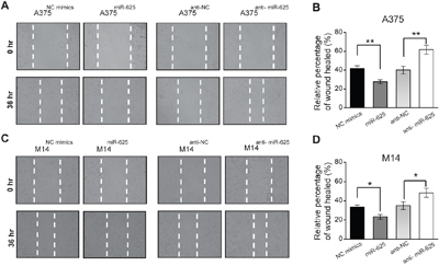 We tested whether miR-625 has an impact on the movement ability of malignant melanoma cells by wound-healing assay. The results are shown in Figure 3A. Restoration of the miR-625 overexpressing cell line A375miR-625 slowly closed the scratch wounds compared with the control group 36 hours after scratching. In contrast, the A375anti-miR-625 cells were significantly efficient in wound healing (Figure 3B). The results in the M14 cell groups were consistent with the above data (Figure 3C and 3D).