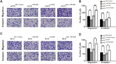 Figure 4: miR-625 inhibits migration and invasion of malignant melanoma cells. A. Representative photographs of migratory or invasive A375NC mimics, A375miR-625, A375anti-NC, or A375anti-miR-625 cells on the membrane (magnification, 100×). B. Average number of migratory or invasive A375NC mimics, A375miR-625, A375anti-NC, or A375anti-miR-625 cells. (*P < 0.05, **P < 0.01). C. Representative photographs of migratory or invasive M14NC mimics, M14miR-625, M14anti-NC, or M14anti-miR-625 cells on the membrane (magnification, 100×). D. Average number of migratory or invasive M14NC mimics, M14miR-625, M14anti-NC, or M14anti-miR-625 cells (*P < 0.05, **P < 0.01). The data represent the mean ±S.D. of three independent experiments.