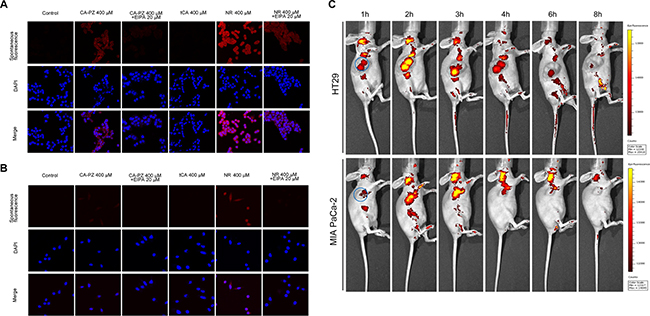 Figure 2: Macropinocytosis assay in colon carcinoma HT29 cells and pancreatic carcinoma MIA PaCa-2 cells. (A) Images of HT29 cells taken by confocal microscopy. As shown, the CA-PZ treated HT29 cells that displayed appreciably high level of macropinosome formation as seen by red fluorescence were similar to NR-treated cells, whereas the control group and tCA group show almost no fluorescence. In addition, the uptake was inhibited by 5-(N-ethyl-N-isopropyl) amiloride (EIPA), a relative specific inhibitor of macropinocytosis. (B) Images of MIA PaCa-2 cells taken by fluorescence microscopy. The appearance of MIA PaCa-2 cells was similar to HT29 cells. (C) In vivo optical imaging in HT29 and MIA PaCa-2 xenograft-bearing athymic mice after intravenous injection of CA-PZ. Representative in vivo fluorescence images at appointed times after tail vein injection of 1.5 mmol/kg CA-PZ. The blue circled area indicates tumor location. Color scale represents photons/s/cm2/steradian.