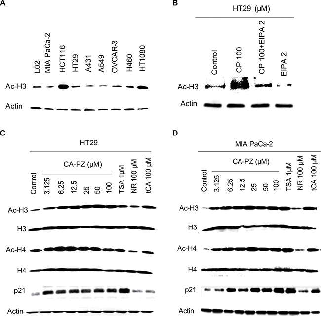 Figure 4: Western blot analysis on the expression of HDAC-related proteins. (A) Expression levels of acetylated histones H3 in various cancer cell lines and the hepatic L02 cells. (B) and (C) Expression levels of acetylated histones H3 and H4, and p21 proteins in HT-29 cells treated with various concentrations of CA-PZ (3.125 μM, 6.25 μM, 12.5 μM, 25 μM, 50 μM, and 100 μM) for 12 h. As shown, the expression levels of Ac-H3, Ac-H4, and p21 proteins were increased. Notably, tCA and the known HDAC inhibitor TSA (1 μM) caused similar changes. However, NR (100 μM) caused less change. (D) Expression levels of acetylated histones H3 and H4, and p21 proteins in MIA PaCa-2 cells treated with various concentrations of CA-PZ. Similar changes as those in HT-29 cells were found.