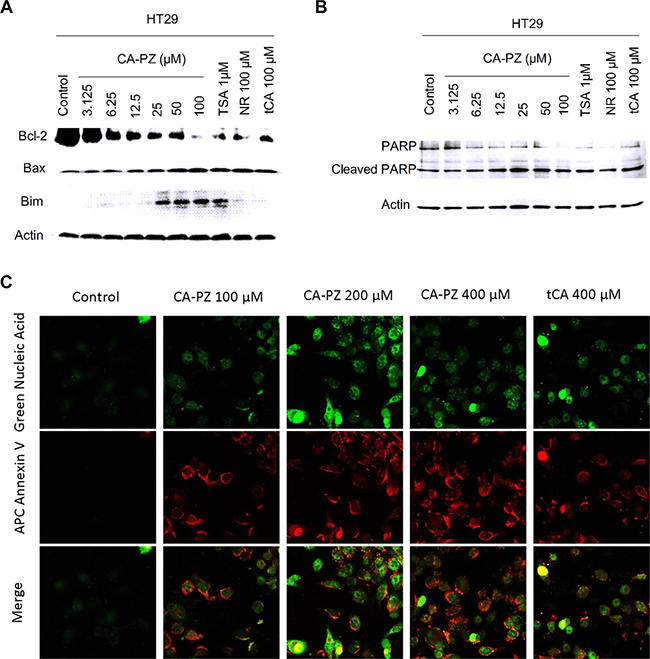 Figure 5: Western blot analysis on the expression levels of apoptosis-related proteins and the staining of apoptotic cells. (A) CA-PZ at a wide range of concentrations for 12 h caused a marked increase in the expression levels of Bax and Bim, while a decrease in the expression level of Bcl-2 in HT29 cells. As shown, tCA at 100 μM, NR at 100 μM, and the known HDAC inhibitor TSA at 1 μM respectively caused changes similar to that of CA-PZ. (B) A decrease of PARP and an increase of cleaved PARP in HT29 cells were found after exposure to different concentrations of CA-PZ, the changes were similar to those induced by the positive control TSA. (C) MIA PaCa-2 cells treated with various concentrations of CA-PZ (100 μM, 200 μM, and 400 μM) for 12 h underwent apoptosis as determined with APC Annexin V and SYTOX® green nucleic acid staining (original magnification 630×). Phosphatidylserine (PS) which translocated to the external leaflet in CA-PZ treated cells was stained by Annexin V, indicating apoptotic cells.