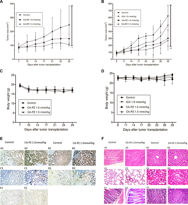 Figure 6: Anti-tumor efficacy of CA-PZ against human colon carcinoma HT29 and MIA PaCa-2 pancreatic carcinoma xenograft in athymic mice. (A) and (B) The growth curves of MIA PaCa-2 and HT29 xenografts in different groups (n = 6) respectively are shown. Tumor volumes are measured every 3 days after treatment. As shown, CA-PZ at the tested doses suppressed the growth of tumors. Significant differences were found between the control group and the CA-PZ treated groups (*P < 0.05; **P < 0.01). (C) and (D) Body weight curves for the treated and the control animals respectively for MIA PaCa-2 and HT29 xenograft-bearing athymic mice. (E) Immunohistochemical staining of the HT29 carcinoma xenograft in CA-PZ treated group (1.5 mmol/kg) and the control group. (magnification 200×): A1 and A2, the IHC staining for Ac-H3; B1 and B2, the IHC staining for Ac-H4; C1 and C2, the IHC staining for cleaved PARP; D1 and D2, the IHC staining for cleaved caspase 3; E1 and E2, the IHC staining for Bim. (F) Histopathological appearance of various organs of the CA-PZ (1.5 mmol/kg) treated and the control xenograft-bearing mice. (H&E. staining, magnification 200×): A1 and A2, heart; B1 and B2, liver; C1 and C2, lung; D1 and D2, kidney; E1 and E2, small intestine; F1 and F2, femur bone marrow. No toxicopathological changes were found in all of the tested organs.